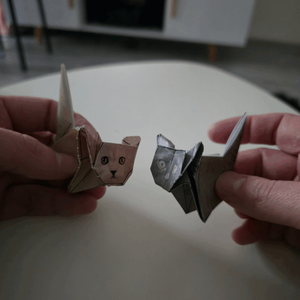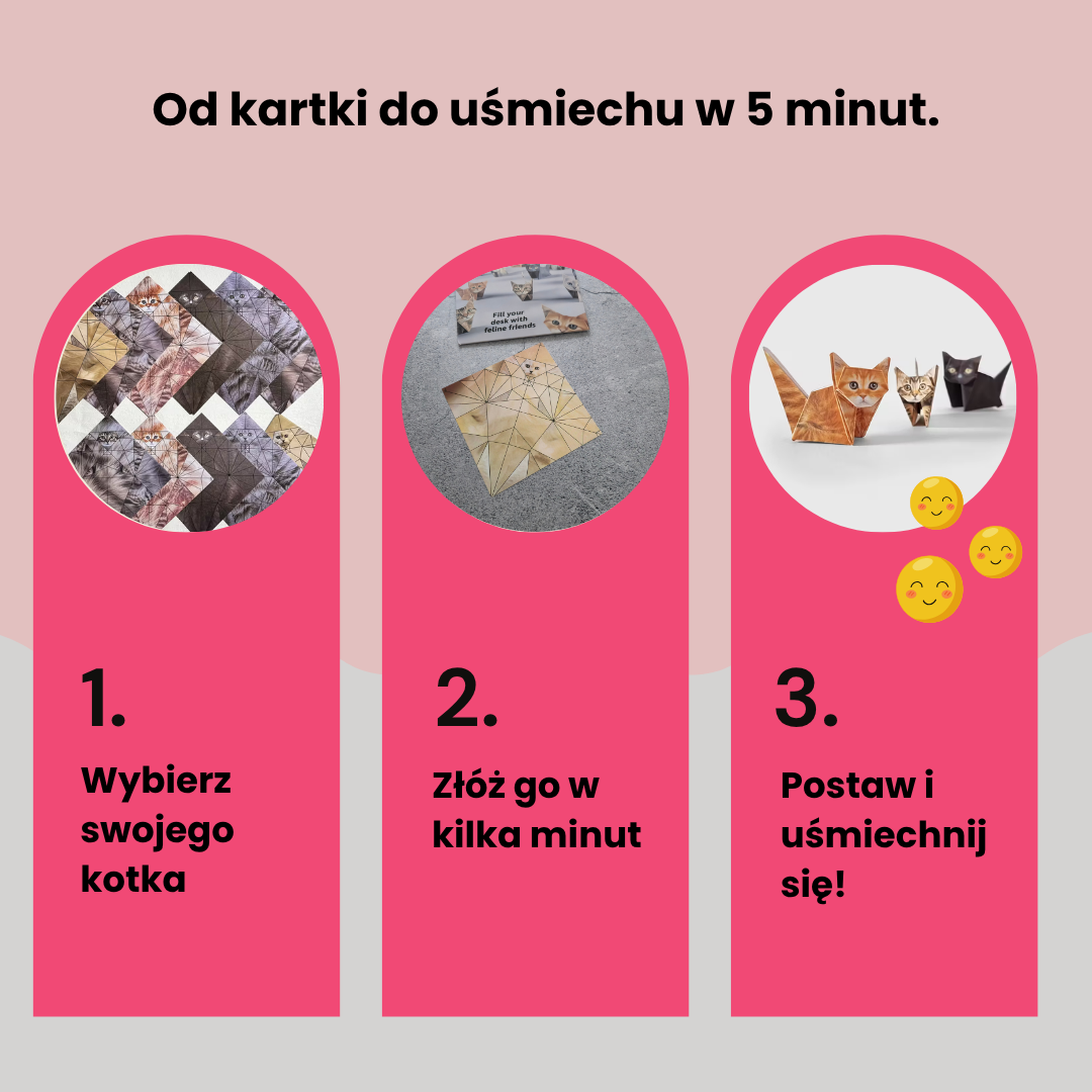 Nie! Każdy kociak ma wyraźne linie zgięć, więc wystarczy dosłownie kilka minut. Nie potrzebujesz doświadczenia ani zręczności — to relaks, nie egzamin z origami. Dzieci poradzą sobie z pomocą dorosłych, a dorośli często mówią, że… to bardziej uspokajające niż joga.